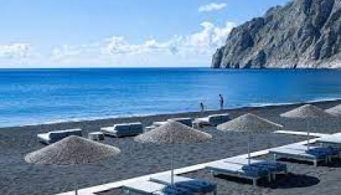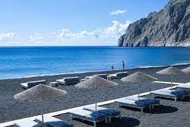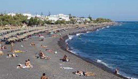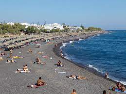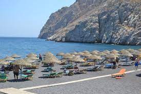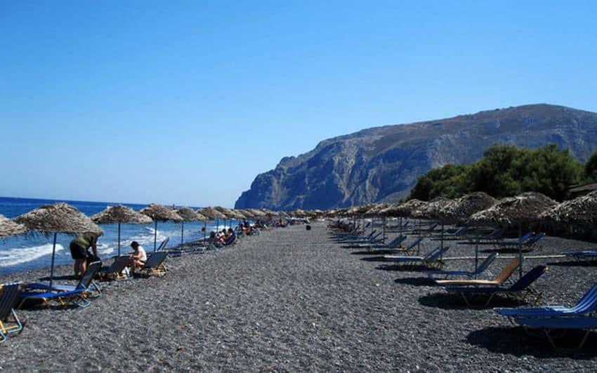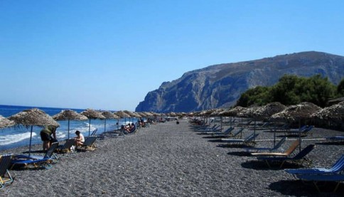 H παραλία Καμάρι είναι από τις μεγαλύτερες της Σαντορίνης, φαινομενικά ατελείωτη, με την μαύρη ηφαιστειακή άμμο να είναι σε τέλεια αντίθεση με το τυρκουάζ μπλε της θάλασσας, δημιουργώντας ένα φανταστικό σκηνικό.