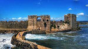 Τα τείχη του φρουρίου προστατεύονται από ευρεία τάφρο και ενισχύονται από δύο προμαχώνες που δεσπόζουν στη βόρεια πλευρά του κάστρου. Στο μέσο της ίδιας πλευράς ανοίγεται η κεντρική πύλη εισόδου που είναι κατασκευασμένη από ορθογώνια λαξευμένους πωρόλιθους και φέρει περίτεχνη διακόσμηση στις παραστάδες της. Το κάστρο έχει ακόμα έξι πύλες εκ των οποίων τρεις βρίσκονται προς την πλευρά του λιμανιού. Οι περισσότερες από τις πύλες ανοίγονται στο ισόγειο πύργου και προστατεύονται από καταφραγές και καταχύστρες.
